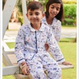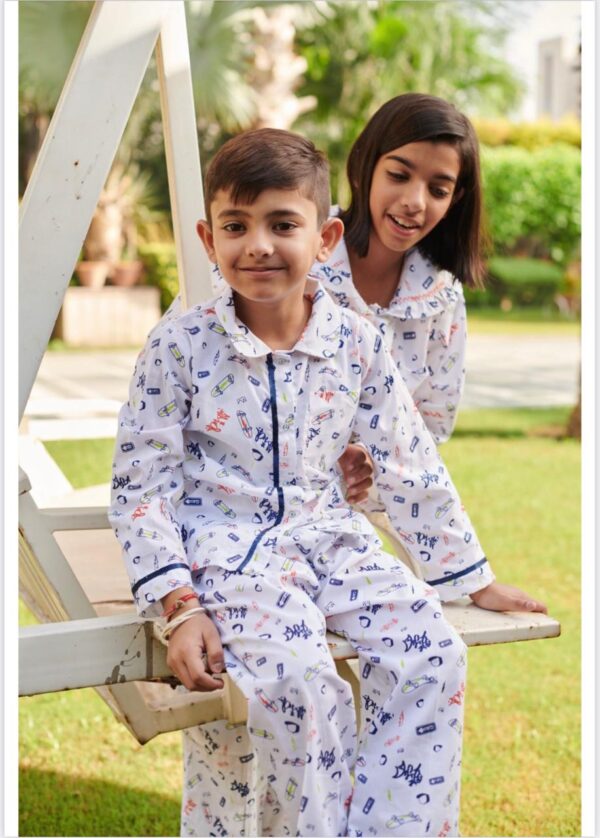 Playful cotton night suit for kids, designed with a colorful doodle print. Includes a button-down shirt and pajama for easy wear and all-night comfort. Perfect for both boys and girls.
